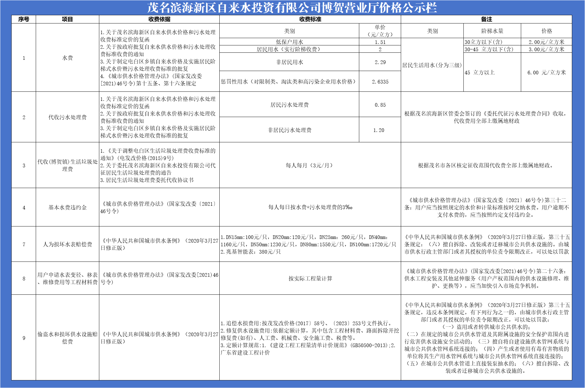 茂名濱海新區自來水投資有限公司自來水收費標準公示