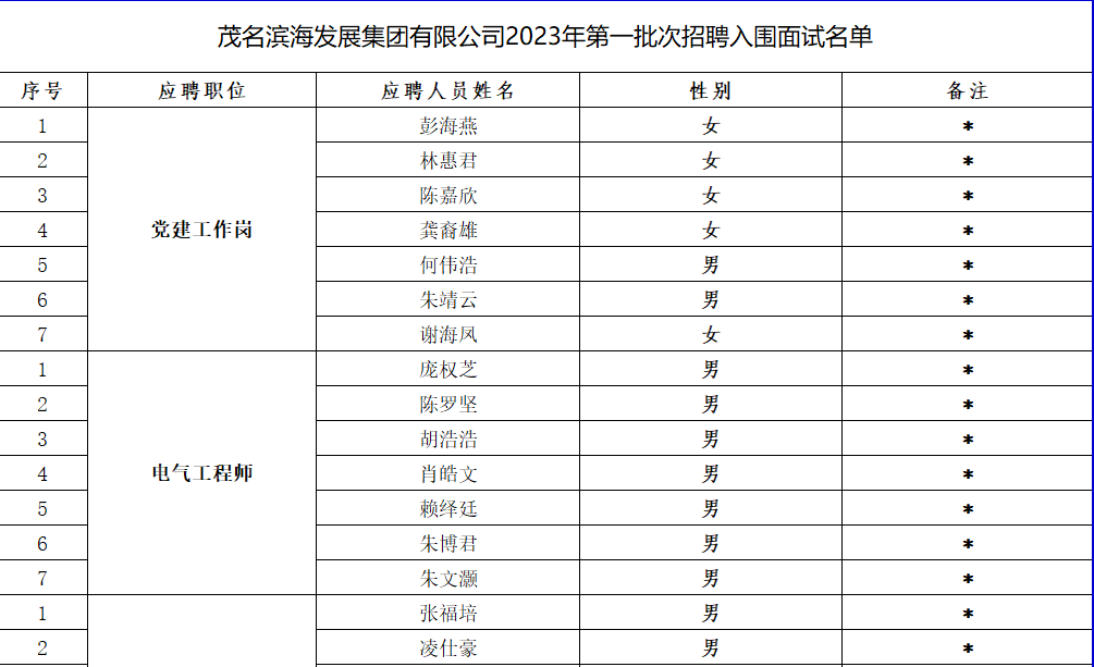 茂名濱海發展集團有限公司2023年第一批次招聘入圍面試名單公示